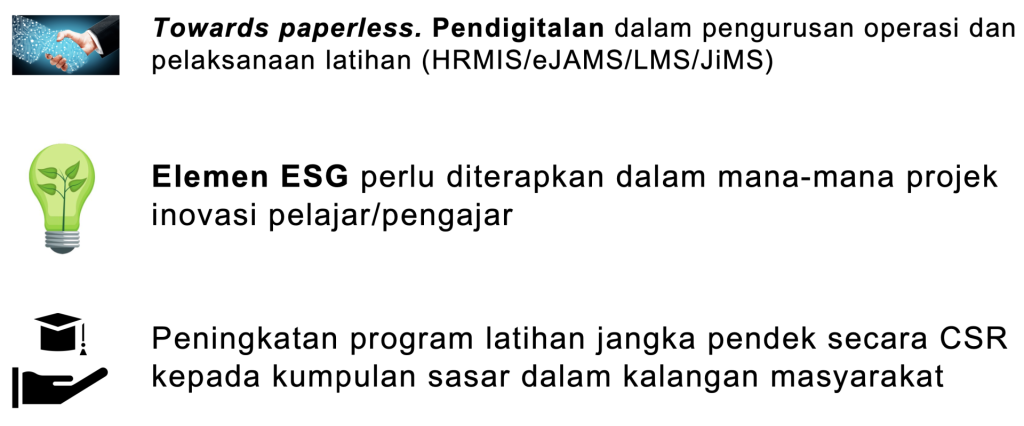 - Memastikan komitmen pengurusan tertinggi dalam penjagaan alam sekitar serta komuniti berdaya saing melalui elemen green TVET.